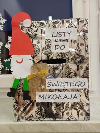 Wszyscy wiedzą o tym, że Mikołaj potrzebuje dużo czasu, aby spakować prezenty dla wszystkich dzieci - to nie jest łatwe zadanie. Chociaż ma wielu pomocników warto jak najszybciej napisać list do św. Mikołaja. Dlatego w oddziałach przedszkolnych pojawiła się wyjątkowa skrzynka na listy - ,,Mikołajowa skrzynka pocztowa’’. Dzieci miały okazję wrzucić do niej swoje listy z prośbą o wymarzone prezenty, jednocześnie zrealizowały pierwsze zadanie -,, List do Świętego Mikołaja’’ z programu ,,Pocztowe Przygody’’.