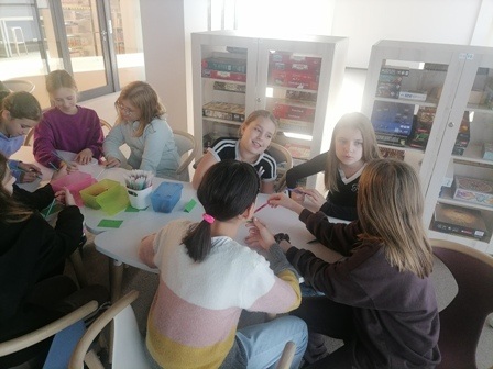 Wizytę w Mediatece rozpoczęliśmy od obejrzenia wystawy pana Mariusza Gosławskiego pt.,, Łódzkie malowane kawą’’. Następnie na uczniów czekały dwie atrakcje . Pierwsza z nich to Strefa Odkrywania , Wyobraźni i Aktywności ,, Sowa’’. To małe centrum nauki zaintrygowało i zachęciło uczniów do eksperymentowania. Podczas prawie godzinnej wizyty odwiedzili wiele ciekawych stanowisk m.in. Labirynt, Sortownik czy Łóżko fakira. Umożliwiło im to sprawdzenie wielu umiejętności : logicznego myślenia, koncentracji i pamięci. Następnym punktem naszej wycieczki był udział w lekcji bibliotecznej przygotowanej przez panią Marię pt.,, Wartości – tajemnica skarbu, który każdy ma w sobie ?’’. Uczniowie bardzo chętnie pracowali w grupach tworząc plakaty prezentujące najważniejsze według nich wartości w życiu. Lekcja pokazała jak dzieci chętnie współpracują ze sobą spędzając czas w miłej atmosferze.