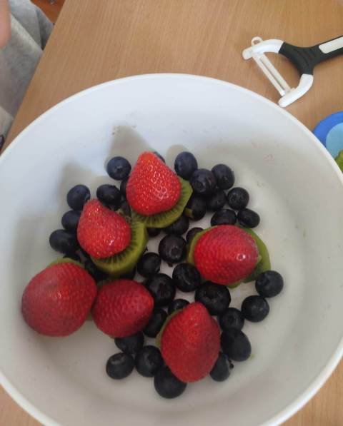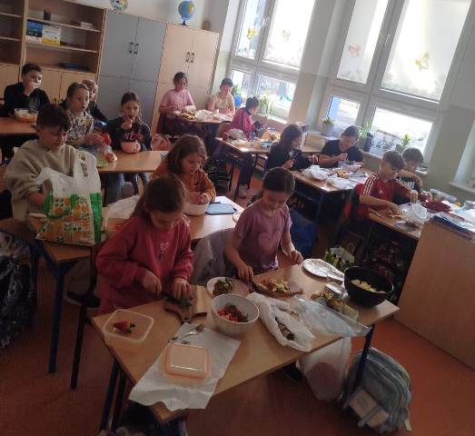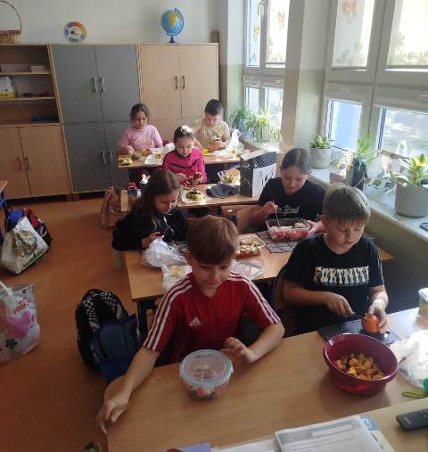 Uczniowie klasy 3b biorą udział w projekcie edukacyjnym „Planeta Zdrowia”. Podczas jednych z zajęć w ramach programu dzieci przygotowały pyszną i zdrową sałatkę owocową. Była to nie tylko świetna zabawa, ale także okazja do nauki – uczniowie poznali, jak ważne dla naszego organizmu są witaminy oraz jaki wpływ mają na zdrowie i dobre samopoczucie.